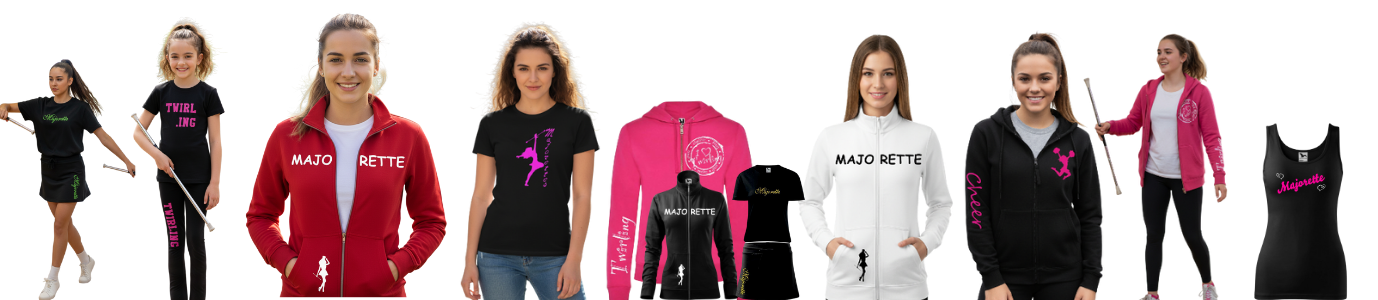 V této katergorii naleznete asi největší nabídku textilu pro mažoretky na jednom místě. Prodáváme textil jen té nejvyšší kvality, a hodně produktů pro Vás sami šijeme. Proto pro nás není problém, některé oděvy upravit na míru, a také potisky, které na oděvech naleznete jsou naší vlastní výroby, proto je možné, téměř každý textilní produkt v naší nabídce individualizovat, tzn. potisknou ho jménem mažoretky nebo názvem klubu, nebo klubovým logem.