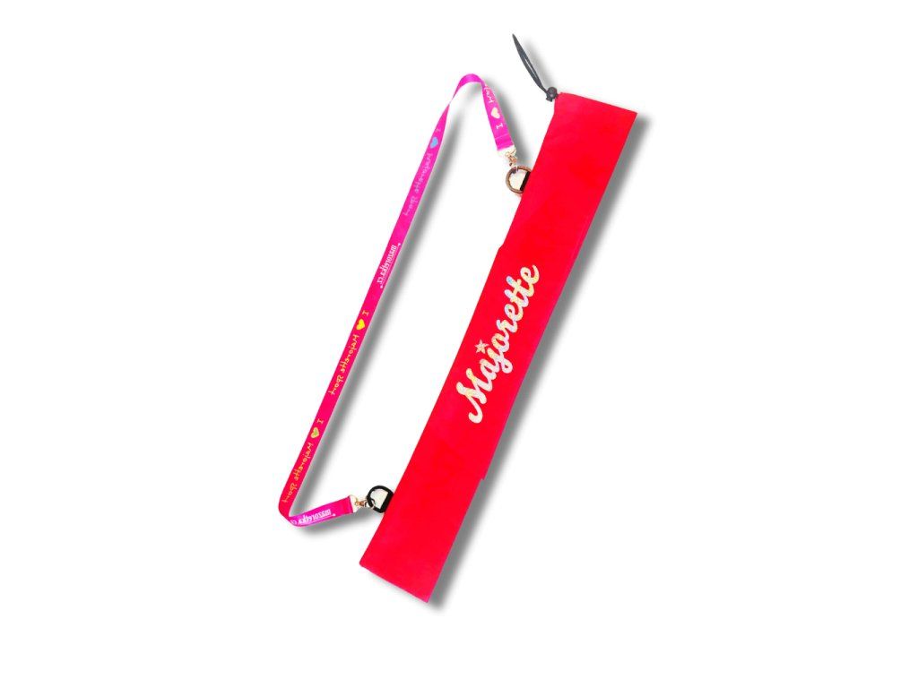 Pokrowiec na laskę wykonany z mocnego czerwonego materiału. Pokrowiec przeznaczony jest na 1-2 pałki. Pokrowiec posiada długi pasek do noszenia na ramieniu. Długość pokrowca wynosi 70 cm! Pasek jest czarny z motywami mażoretkowymi. Nadruk wykonany jest srebrnym neonowym kolorem. Pokrowiec można dodatkowo zadrukować imieniem juniorki lub nazwą klubu. Możliwość wyboru koloru paska, standardowo dostarczany jest pasek czarny, ale można go wymienić na różowy.